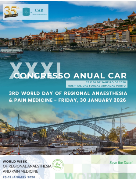 XXXI CONGRESSO ANUAL DO CLUBE DE ANESTESIA REGIONAL 29 e 30 de janeiro de 2026 - Hospital das Forças Armadas – Polo do Porto| Mais Informações DATAS IMPORTANTES: 3rd World Day of Regional Anaesthesia & Pain Medicine
